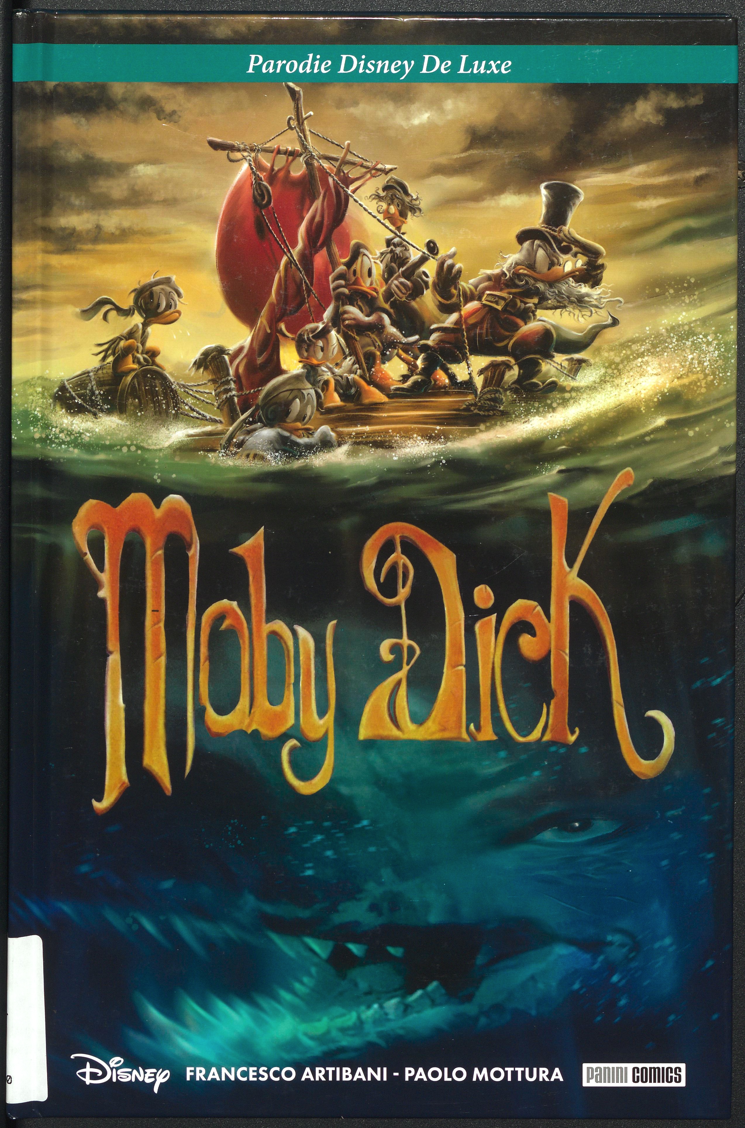 Il romanzo di Melville è in effetti uno di quei libri che possono davvero essere definiti un ‘classico moderno’ e quello di Benni non è l’unico testo che, in maniera più o meno fedele, ne prende ispirazione. Anche tra i fondi della Biblioteca dell’Archiginnasio si trovano molte opere ispirate, in vario modo, a Moby Dick. Si possono nominare due versioni a fumetti, una con personaggi umani (si veda qui la copertina), un’altra con protagonista Paperino (qui potete vedere la copertina e la prima tavola); una riduzione per bambini, ma anche un articolo scientifico intitolato Le balene di Melville.