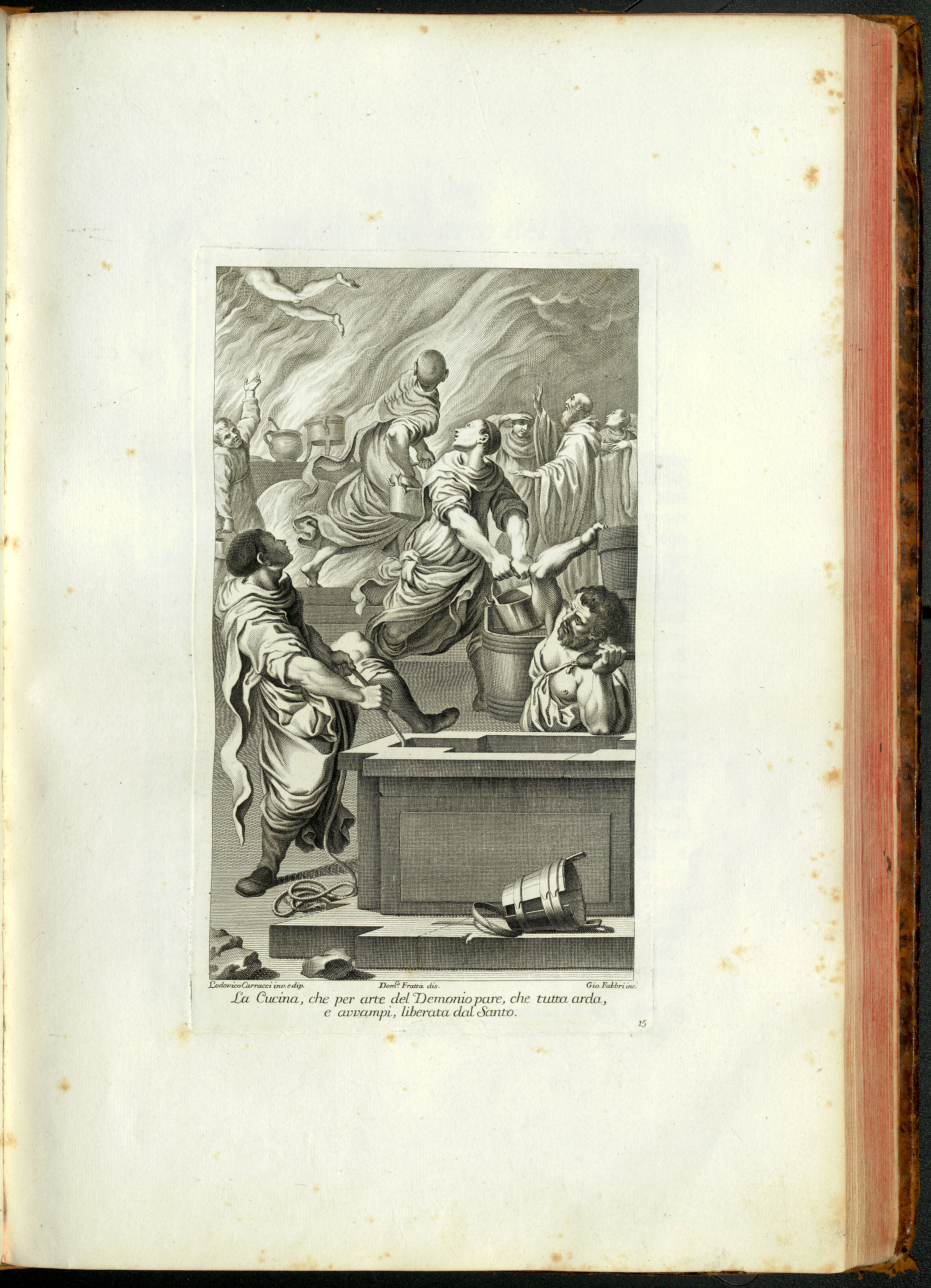 Il racconto di una visita diabolica in cucina riporta alla memoria uno dei dipinti che decorava il chiostro di S. Michele in Bosco degli Olivetani di Bologna, opera di Lodovico Carracci. Il ciclo pittorico raccontava in gran parte scene della vita di S. Benedetto. Destinato a sparire a causa della consunzione del tempo, a più riprese si decise di fissarne la bellezza con un volume che ne fotografasse, tramite incisioni, le opere di Carracci e di altri pittori. Un Nota storica di Carlo Degli Esposti ricostruisce sia le vicende della decorazione del chiostro che quelle della realizzazione del volume che, dopo diversi ritardi, venne pubblicato nel 1776. Da questo è tratta l’incisione che fissa sulla pagina il dipinto di Carracci dedicato alla visita del Diavolo alla cucina, in cui i frati si affannano a spegnere l’incendio che ne consegue, come illustrato nella descrizione che accompagna l’immagine.